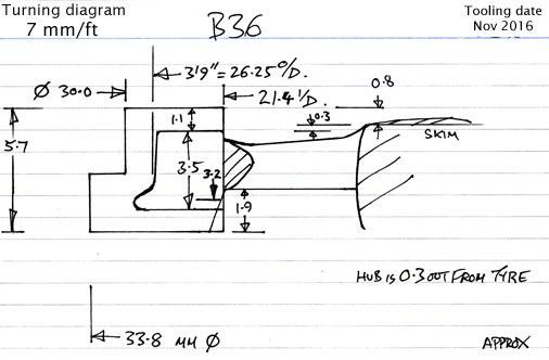 Casting: 25.25 mm tread dia., 21.5 mm i/d., hub 0.3 mm out from the tyre.