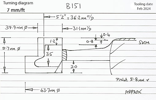 Casting: 36.2 mm tread dia., 31.1 mm i/d., hub 0.8 mm out from the tyre, pin at 5.5 mm.